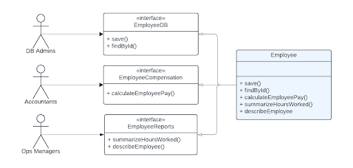 Say we have a fat class with a lot of methods in it and multiple actors depend on those methods. That's breaking the Single Responsibility Principle. If we don't want to separate the methods into separate classes, we can implement interface segregation and give each actor its own interface to use instead.